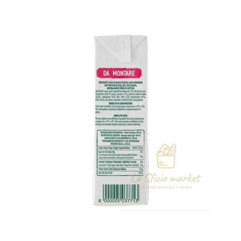 Acqua, grassi vegetali non idrogenati (palmisto, cocco), zucchero, proteine isolate di soia (0,5%), stabilizzanti (sciroppo di sorbitolo, idrossi-propil-cellulosa), emulsionanti (esteri mono- e diacetiltartarici di mono- e digliceridi degli acidi grassi, polisorbato 60, lecitina di soia), sale, aromi, colorante (beta-carotene).